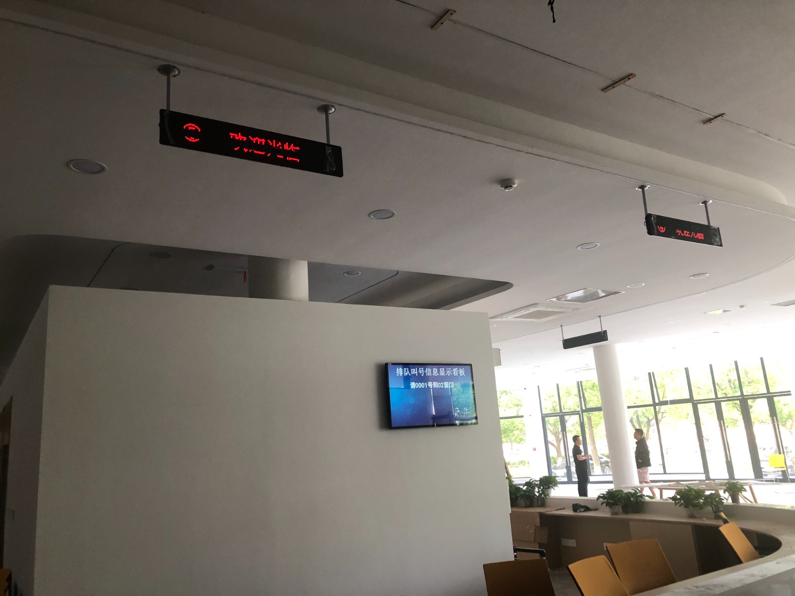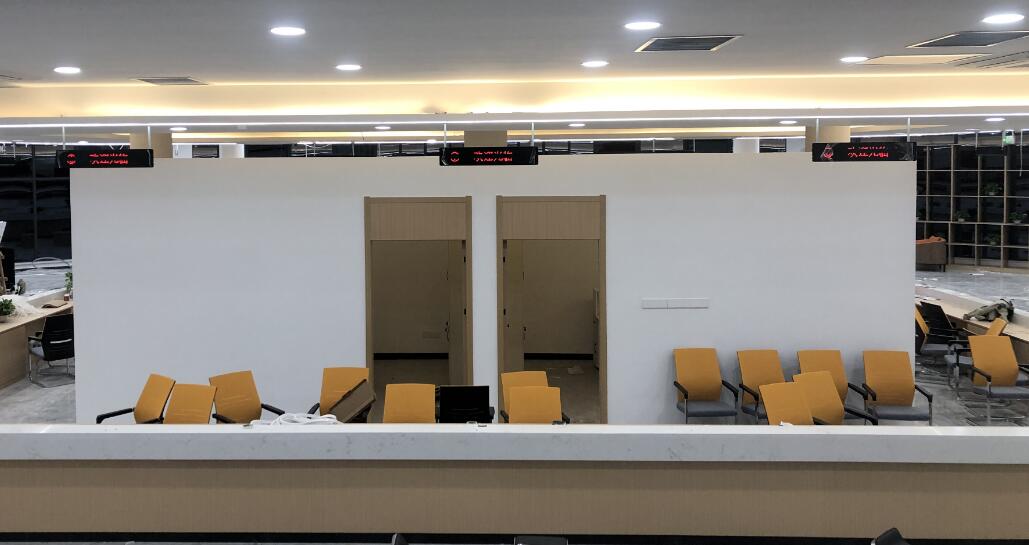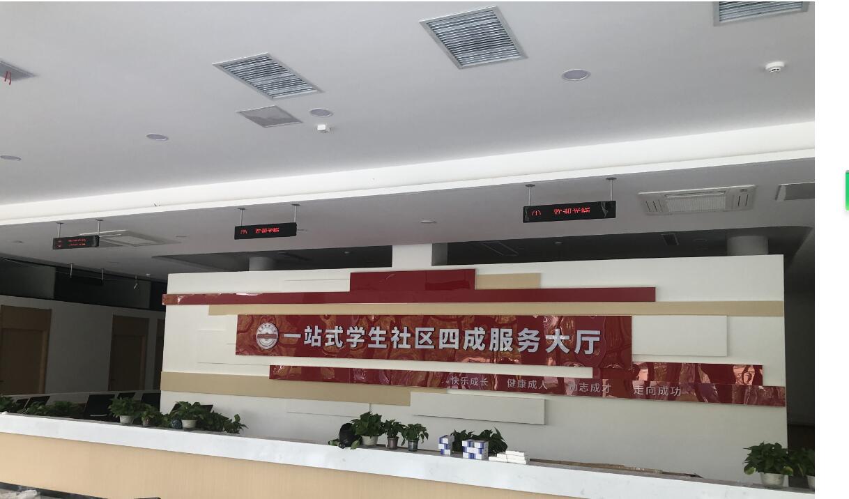 安慶師范大學(xué)一站學(xué)生社區(qū)辦事區(qū)域為環(huán)形設(shè)計,為此我司為學(xué)生社區(qū)中心設(shè)計在大廳入口處設(shè)置1臺22寸取號機,供來學(xué)生取號辦事,在環(huán)形工位的上方設(shè)計單行8漢字的窗口屏來顯示窗口辦理的業(yè)務(wù),并且工位會配備1臺呼叫器;在靠近等候區(qū)的辦公區(qū)域設(shè)置了1臺43寸顯示屏,展示綜合叫號信息,也和環(huán)形區(qū)域的功放喇叭在看的同時也可以通過聽來查看排隊信息。